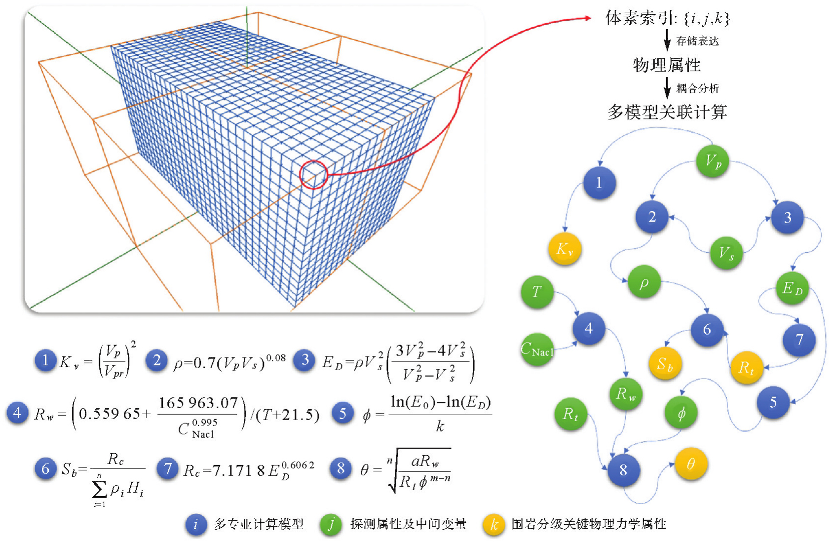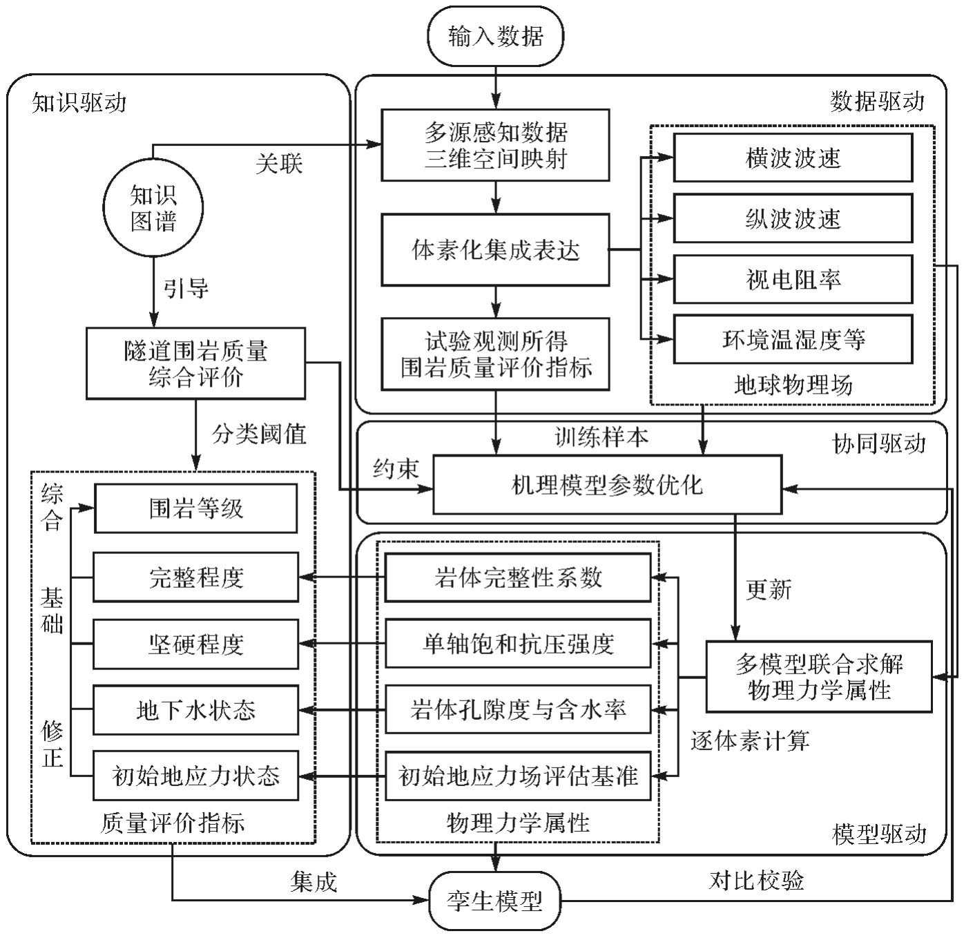 隧道围岩高精度数字孪生模型是工程优化设计与安全质量效益多目标精准管控的关键基础。围岩孪生建模主要融合多源异质感知数据对围岩属性和结构进行动态三维建模,由于数据在模态、语义及空间分布等方面存在显著差异,现有建模方法难以自动化、智能化融合处理。为此本文提出数据模型知识协同驱动的建模方法,利用体素结构集成多源数据以统一模态及空间分布,联合地球物理、岩土力学等多模型求解围岩物理力学属性,引入分级规则消除与实测指标的语义差异,动态接入探测数据优化机理模型参数,通过知识图谱引导数据模型知识协同驱动的自动化更新建模,共覆盖16种关键要素。选取典型铁路隧道进行验证,构建了随施工动态更新的0.5 m分辨率围岩体素模型,质量评价指标分类准确率高于85%,相比现有方法提升约10%。