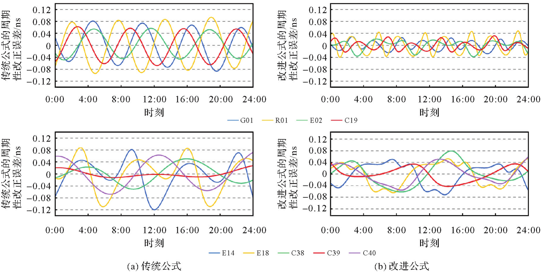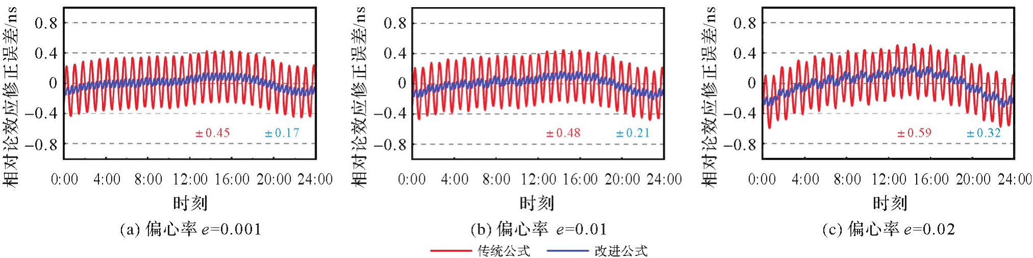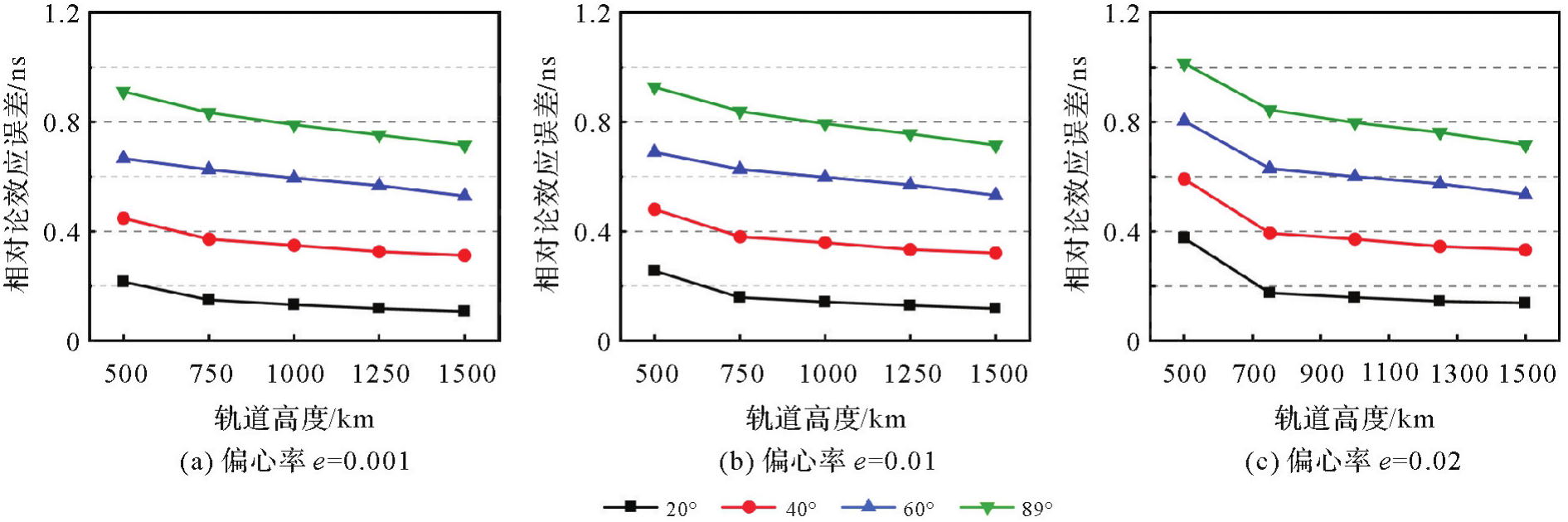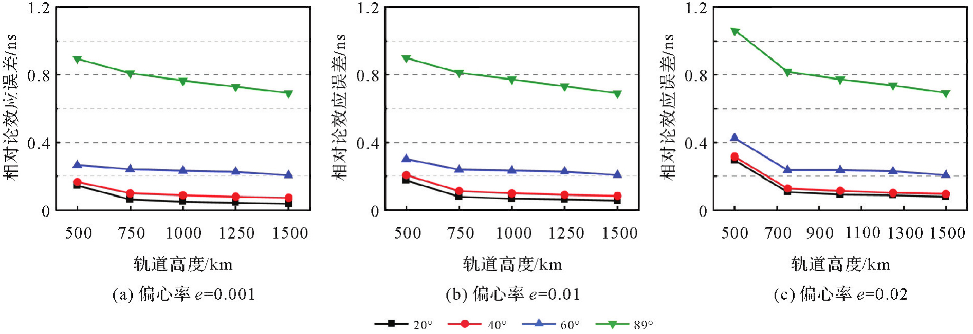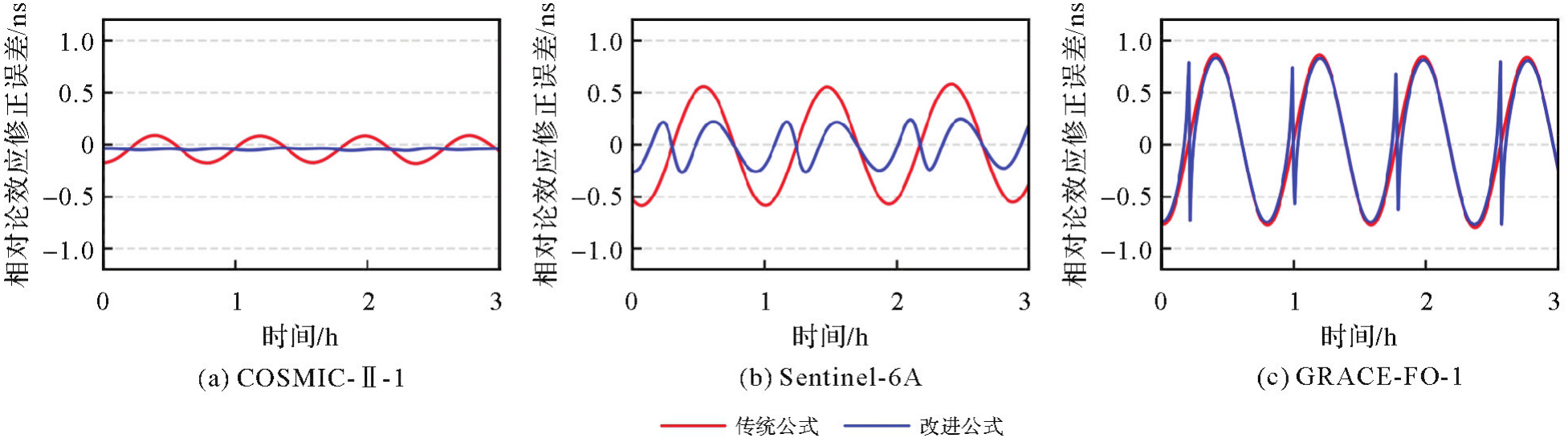 全球导航卫星系统的相对论效应误差来源于卫星与用户接收机间的运动状态差异,涉及引力频移和时间膨胀效应。相较于中高轨卫星,低轨导航卫星受地球非球形引力摄动和时间膨胀效应更为显著,已有相对论效应改正方法的适用性需要进一步探讨。本文回顾了相对论效应改正严密公式和目前IGS分析中心与各导航系统使用的两种近似公式(传统公式和改进公式),其中传统公式仅考虑了卫星受到的地球中心引力并针对小偏心率情况进行了简化,改进公式则进一步考虑了地球J2项引力影响。分析了两种近似公式对GPS、GLONASS、Galileo和BDS-3系统的相对论效应改正精度,并通过仿真与实测数据重点研究了两种近似公式的改正精度与低轨卫星轨道高度、倾角和偏心率等参数之间的关系。结果表明,相对论效应改正传统公式对中圆轨道卫星(E14、E18除外)的周期性改正误差振幅为0.11 ns,改进公式减小至0.05 ns;传统公式对倾斜地球同步轨道卫星的周期性改正误差振幅为0.05 ns,优于改进公式的0.06 ns;两种近似公式对低轨卫星相对论效应的改正精度明显下降,且受轨道参数影响显著,轨道倾角越大、轨道高度越低和偏心率越大时,改正精度越低,近极轨卫星的周期性改正误差振幅可达1 ns。