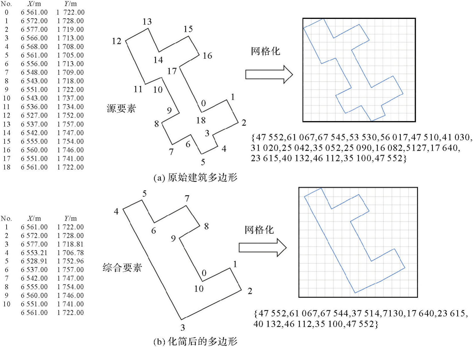 Addressing the issues in building polygon simplification within map generalization—such as reliance on manual rules, low automation, and difficulty in reusing existing simplification results—this paper proposes a building polygon simplification model based on the Transformer mechanism. The model begins by mapping building polygons into a grid space of a certain scale, representing coordinate strings of the polygons as grid sequences. This process allows the acquisition of Token sequences before and after simplification, thereby constructing paired datasets of building polygon simplification samples. Utilizing the Transformer architecture, the model learns dependencies between point sequences through its masked self-attention mechanism, ultimately generating new simplified polygons point by point to achieve building polygon simplification. During training, the model employs structured sample data and incorporates a cross-entropy loss function that ignores specific indices to enhance simplification quality. The experimental design consists of two parts: a main experiment and a generalization validation. The main experiment, based on the Los Angeles 1∶2000 building dataset, encodes polygons using three grid sizes—0.2, 0.3, and 0.5 mm—to achieve simplifications at target scales of 1∶5000 and 1∶10 000. Results indicate that the model performs optimally with a grid size of 0.3 mm, achieving a consistency rate exceeding 92.0% with manual annotations on the validation set. A generalization experiment on building polygon data from parts of Beijing further verified the model's transferability. Comparative analysis with an LSTM model, under similar parameter scales, showed that the LSTM model failed to converge effectively and could not produce usable results. This study confirms the potential of Transformer in handling spatial geometric sequence tasks and demonstrates its ability to effectively reuse existing simplification samples. The proposed approach offers a new, engineering-practical pathway for intelligent building polygon simplification.
