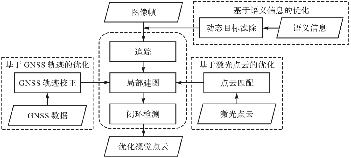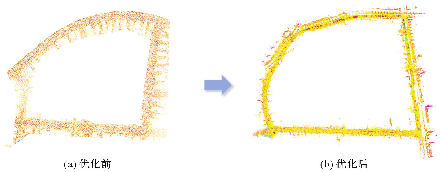 视觉传感器是目前道路众源变化检测中最常见的感知传感器。针对视觉SLAM在道路杆状物众源变化检测中的精度与稳健性瓶颈,本文提出一套视觉点云质量优化支持的道路杆状物变化检测技术框架。首先,通过融合语义约束、激光点云深度与GNSS全局校正,构建视觉点云优化方法,显著提升了轨迹精度与点云质量;其次,基于优化后的视觉点云,实现道路杆状物的精准提取与定位;然后,引入基于哈希映射的快速匹配策略,完成跨期杆状物的鲁棒变化检测;最后,在同济大学周边采集的两期试验数据上验证了整体流程的有效性。试验表明,本文方法的轨迹平均绝对误差(MAE)与均方根误差(RMSE)分别降低68.39%和65.65%,点云密度平均提升57.97%。在要素定位与变化检测任务中,杆状物要素的平均定位误差在单一方向上为2~3 m,平均平面误差约为3.5 m,杆状物匹配精度达到94.8%,新增与移除杆状物的变化检测准确率与召回率均为100%。结果证明了本文方法的有效性和稳定性,证实了多源数据融合与优化技术在道路杆状物变化检测中的应用价值,为高精地图变化检测与道路设施智能化管理提供了可靠的技术路径。