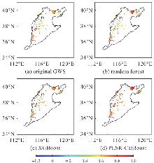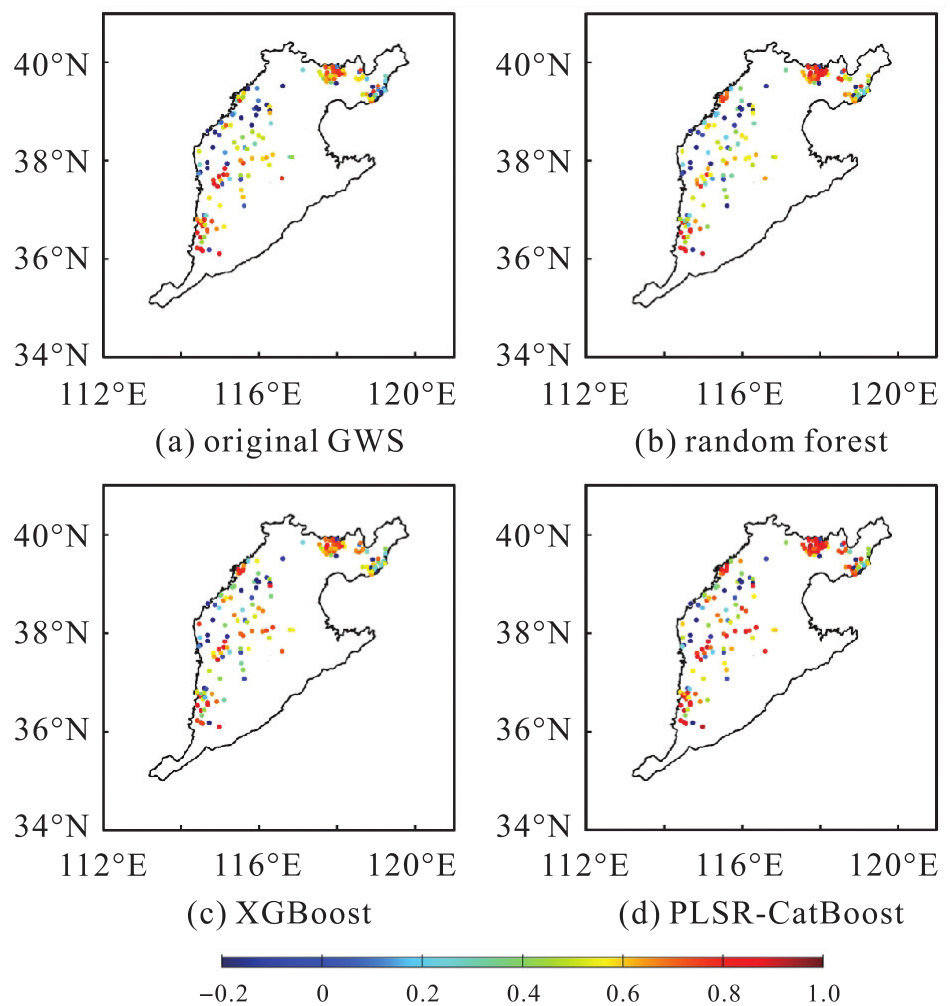 GRACE与GRACE-FO重力卫星为全球地下水储量(GWS)变化监测提供了一种手段,但其空间分辨率较低,难以满足区域水资源精细化管理需求。本文针对华北平原地下水储量监测问题,提出一种基于特征加权CatBoost模型的降尺度方法,融合多源数据集,以提升GRACE(GRACE-FO)数据的空间分辨率。首先,利用贝叶斯三角帽方法(BTCH)对6组GRACE-FO数据进行加权融合,构建稳定可靠的区域地下水储量基础数据;然后,基于偏最小二乘回归(PLSR)提取各特征变量的重要性投影值(VIP)并构建特征加权机制,提升模型对关键特征变量的响应能力;最后,结合具有有序目标编码和有序梯度提升机制的CatBoost模型开展降尺度建模,将GWS数据的空间分辨率尺度从1°降至0.25°,并通过实测水井水位数据进行对比验证。与降尺度前GWS数据相比,降尺度结果与实测水井水位数据的相关性显著提高,且展示出更加丰富的细节。与传统的随机森林(RF)和XGBoost方法相比,本文方法在空间趋势一致性与物理真实性方面均表现更优,显著提升了GRACE(GRACE-FO)地下水反演结果的可靠性与实用性。