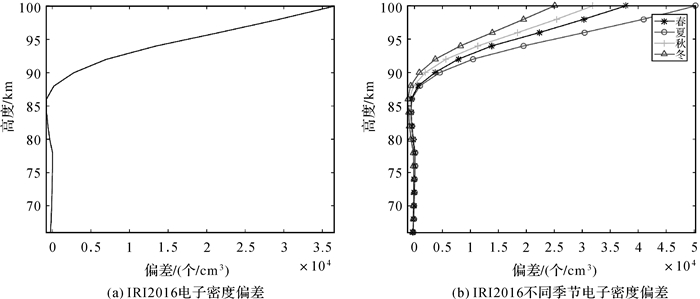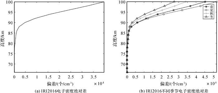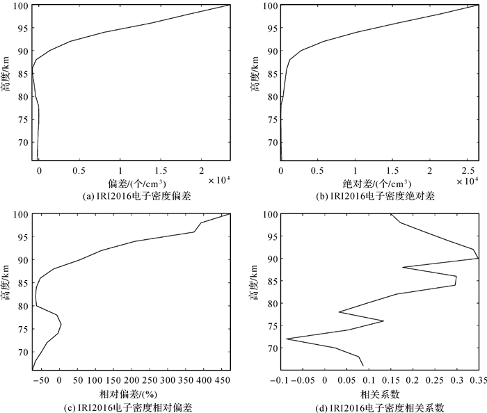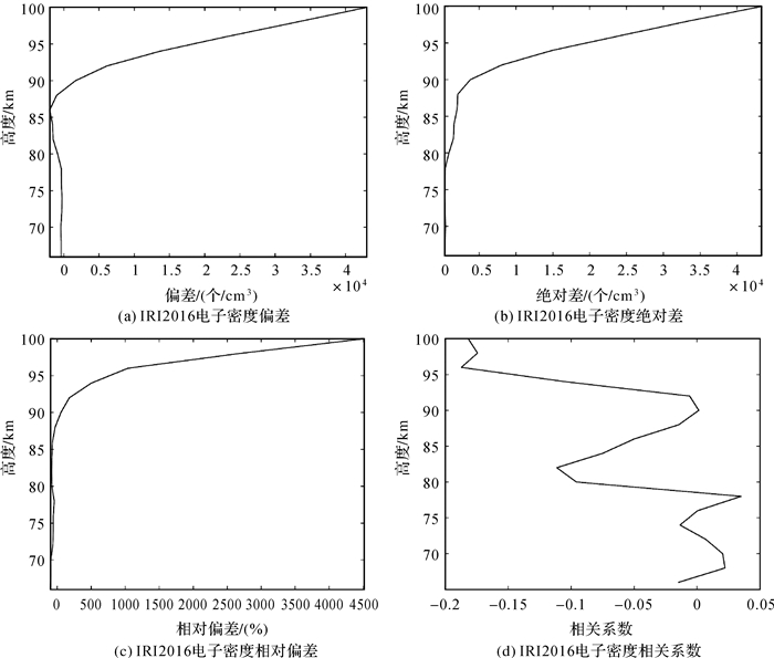 (1) IRI2016模型电子密度偏差、绝对差与高度和季节存在紧密关系。其偏差和绝对差在高度60~90 km变化较小、在高度90~100 km随高度增加而快速增大;需注意的是,虽然偏差、绝对差的最大值均出现在顶层(100 km),但最小值均未出现在底层(60 km)。
