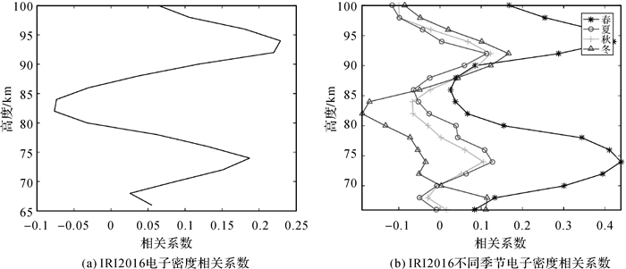 IRI2016模型与中频雷达之间的电子密度相关系数、不同季节电子密度相关系数值随高度变化特征如图 3所示。在图 3(a)中,高度80~86 km范围内为负相关,其他高度范围为正相关,但相关系数值较小(最大值不超过0.25),与偏差、绝对差随高度变化特征不同,相关系数随高度增加呈现出增大、减小的交替变化特征;在高度60~100 km的相关系数值范围为-0.076 6(82 km)~0.228 9(94 km),平均值为0.079 9。从图 3(b)可明显看出,不同季节之间的电子密度相关系数值随高度增加存在明显差异,但呈现出较一致的增大、减小交替变化特征;在高度60~100 km,春季、夏季、秋季、冬季的相关系数值范围分别为“0.025 3(86 km)~0.438 8(74 km)”、“-0.116 3(100 km)~0.127 0(74 km)”、“-0.099 9(100 km)~0.122 8(92 km)”和“-0.188 9 (82 km)~0.166 5(92 km)”,平均值分别为0.223 2、0.003 6、0.006 8和-0.011 4;从上述分析可看出,不同季节的电子密度相关系数值在整个高度层均较小,最大值不超过0.45,且在某些高度层均存在负值。