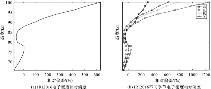 IRI2016模型与中频雷达之间的电子密度相对偏差、不同季节电子密度相对偏差随高度变化特征如图 4所示。在图 4(a)中,相对偏差在高度60~86 km内变化不大,且以负值为主,而在高度88~100 km范围内随高度增加而快速增大,且均为正值,在高度100 km达到最大值;在整个高度范围内,相对偏差的值范围为-79.261 1%(60 km)~632.734 4%(100 km),平均值为93.600 2%;不同季节之间的电子密度相对偏差随高度变化存在较明显差异(图 4(b)),其中,在高度60~90 km,各高度层的相对偏差值由小到大依次均为夏季、春季、秋季、冬季;当高度超过90 km时,随着高度增大,不同季节的相对偏差均快速增大,且均为正值,此时各高度层上的相对偏差值由小到大依次分别为春季、冬季、秋季、夏季,与高度60~90 km存在一定差异。在整个高度范围内,春季、夏季、秋季、冬季的相对偏差值范围分别为-76.310 1%(66 km)~303.333 0%(100 km)、-73.077 6%(66 km)~1.262 4×103%(100 km)、-79.220 7%(66 km)~762.542 3 (100 km)、-90.458 4%(66 km)~622.691 6% (100 km),平均值分别为47.800 1%、204.749 5%、103.599 1%、62.142 8%,由小到大依次分别为春季、冬季、秋季、夏季。