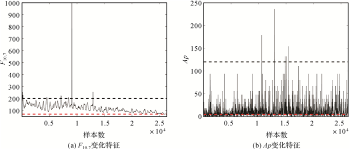 为反映不同地磁、太阳活动条件下的IRI2016模型精度特征,基于文献[23],本文将太阳活动分为太阳活动低年(F10.7≤70)、太阳活动高年(F10.7≥200);地磁条件分为磁宁静(Ap≤5)、磁暴(Ap≥120)。图 5为2014—2016年(时间分辨率为1 h) F10.7和Ap的变化特征,其中,横坐标样本数,共有26 304个(即:24×(365+365+ 366)),图 5(a)中的粗黑虚线、粗红虚线分别代表F10.7=200、F10.7=70,图 5(b)中则分别代表Ap=120、Ap=5;针对2014—2016年的F10.7和Ap变化特征,本文按地磁条件、太阳活动分为4类,分别为①F10.7≤70,Ap≤5,总样本数为60;②F10.7≤70,Ap≥120,总样本数为0;③F10.7≥200,Ap≤5,总样本数为150;④F10.7≥200,Ap≥120,总样本数为3。由于②的样本数为0、④的样本数仅为3,下面仅针对①、③条件情况下的IRI2016模型电子密度精度特征进行研究。
