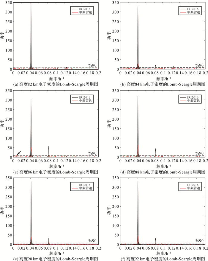 利用Lomb-Scargle周期图方法可分析某一高度层的大气频谱特征。该方法[24-25]分析序列数据中的频谱分布特征具有独特优势,一方面可以给出分辨率比1/T(T为序列数据的跨度)更精细的功率谱,另一方面可以对不均匀采样数据进行直接处理,最大程度地给出原数据的谱信息。该特点使得Lomb-Scargle周期图方法非常适用于对含有缺测数据的资料进行谱分析,因此该方法的应用十分广泛[26-28]。通过上述分析结果可知,IRI2016模型与中频雷达之间的电子密度存在较明显差异,且差异特征与高度密切相关,为进一步认识IRI2016模型与中频雷达电子密度之间的差异特征,本文采用Lomb-Scargle周期图法对中频雷达、IRI2016模型电子密度数据(高度分别为82、84、86、88、90、92 km)进行频谱分析,并得频谱特征进行对比研究。