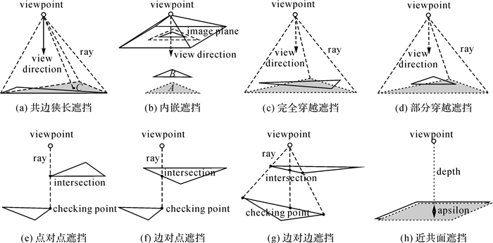 目前,文献[5-11]使用光线追踪算法[12-15]和Z缓冲区算法[16-22]解决多视纹理映射的可见性问题。光线追踪算法的基本原理为:从视点V向三维表面模型上的一点P发射光线L,若L在到达P之前与模型产生了碰撞,则P为不可见点;否则,P为可见点[23]。文献[6]利用光线碰撞检测开源库[24]对面元的3个顶点进行可见性检测,若3顶点均可见则该面元可见。但是,有限顶点的可见性并不能保证整体面元的可见性(如图 1(a)(c)(d)中,虽然阴影面元的3个顶点在当前视点下均可见,但整体面元实际不可见)。为了解决上述问题,在可见性检测中必须提高光线追踪的密度。但是,高采样密度将导致时间开销呈指数级增长。尽管对模型构建层级树状索引[12-13, 15]可以提高光线追踪的效率,但是当模型中存在较多与坐标轴平行的面元时,索引结构带来的提升并不显著[25]。另外,当碰撞的交点恰好位于顶点、边上时(如图 1(e)-(g)所示),可见面元又会被识别为不可见面元。Z缓冲区算法的基本思想为:设dp为点P到视点V的距离,lp为P经过透视变换后存储在Z缓冲区中的深度;若dp≤lp,则P可见;否则,不可见。Z缓冲区算法的本质是基于透视变换将三维模型的连续可见性问题转化为二维投影平面上的离散可见性问题[23, 26]。因此,当且仅当投影后面元的内部像素均满足dp≤lp时,该面元方可识别为可见面元。当多视影像数据大、三维表面模型面元密集时,基于逐像素检测面元可见性的效率会很低。为了减少采样次数,文献[5, 21]降低了Z缓冲区的分辨率。但是,这种方案会导致Z缓冲区储存的深度无法正确地反映模型的空间分布,从而降低了可见性检测的精度。