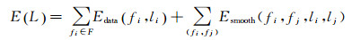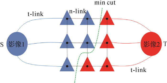 在得到每张影像的完全可见面元后,根据面元之间的拓扑邻接关系构建标签图G(V, E)。如图 11所示,G(V, E)由顶点V和边E组成,其中左右两个终端节点为图的源点S和汇点T,代表两类不同的标签;其余中间节点代表完全可见面元。节点之间通过t-link和n-link边连接。t-link为连接终端节点与中间节点的边,边上的权重代表中间节点被指定为不同标签的概率;n-link为连接中间节点的边,边上的权重代表邻接面元被指定为同一标签的概率。多标签分类问题本质是求解一组标签集和实现最大化后验概率(maximum a posteriori,MAP),其等价于最小化后验能量函数[35]。在计算机视觉中,图割是最小化能量函数的经典算法[36]。本文采用文献[6]中的方法构建能量函数