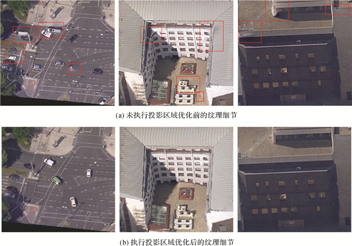 图 16-图 19是M1对应的纹理细节区域。其中图 16为没有执行可见性检测时的纹理效果,因此靠右的两张截图其纹理质量很差;左侧的截图纹理效果较好,这是由于对应的区域是一平面结构,不包含复杂的遮挡情况,通过投影参数就可获取正确的可见纹理。图 17验证了本文的投影区域优化对纹理映射的有效性。在投影区域优化后,纹理模型的质量得到明显提升,纹理错位、扭曲以及接缝等问题均被消除。对比图 16和图 17(b),可以看出,高精度的可见性检测对纹理映射的质量具有显著的促进作用。图 18和图 19分别是使用Z缓冲区算法和光线追踪算法进行可见性检测后的纹理效果,可以看出,由于受到人工偏差的影响,无法实现精确的可见性检测,导致纹理模型中存在较多瑕疵。图 20-图 22为本文算法与商业软件ContextCapture和开源软件MVE-Texturing的对比结果,其中上面一行的纹理结果对应于M1,下面一行的纹理结果对应于M2。可以看出基于本文算法生成的纹理模型相较于其他两者,具有更高的保真度和结构完整性。