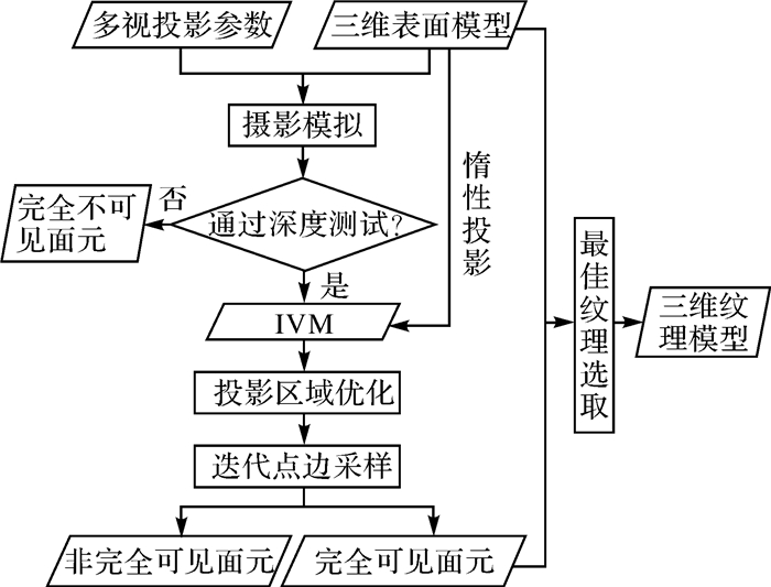 针对多视纹理映射中的可见性检测问题,本文基于图形学渲染管道提出一种快速、准确的可见性检测方案。其最大贡献为:在无需设定偏差的前提下实现可见性检测。首先,本文设计了一种基于着色器编程的摄影模拟方案。在模拟的过程中,每张影像视角下的完全不可见面元会被深度测试自动排除,可见面元经过光栅后形成IVM。IVM具有3条空间属性(轻量性、一致性和连续性)。基于这3条属性,面元可见性可以被准确地检测。然后,对投影到IVM上的面元执行投影区域优化。与其他相关文献[5, 7-10]相比,本文首次将投影区域优化考虑到基于像素进行可见性检测的过程中,这对可见性检测的精度具有显著的促进作用。其次,在可见性分类阶段,提出惰性投影和迭代点边采样算法来减少处理的面元数和采样次数。最后,在检测出每张影像视角下的完全可见面元后,笔者根据完全可见面元之间的拓扑关联构建马尔科夫随机场[28]并使用图割算法[29, 30]选择最佳纹理。图 2为本文算法的框架流程。