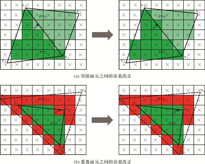 (3) 取vp所对应的三角面元tj,使用LEF和TLR判断p是否属于tj:若不属于,说明p所在的位置存在栅格化误差,将p的属性值vp修改为面元ti的索引值i(如图 6(a)所示);否则,转步骤(4);