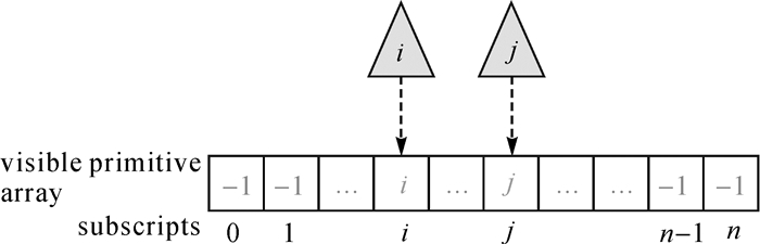 1.3.1 惰性投影目前,相关研究在执行可见性检测之前,会根据影像的投影参数执行反向面元剔除和视截体筛选,减少面元的处理数量。然而,经过反向面元剔除和视截体筛选后仍存在较多的完全不可见面元。为了避免处理这些完全不可见面元,本文利用着色器存储缓冲对象(shader storage buffer object,SSBO),记录可见面元的索引值。由于打开了早期深度测试,因此只有可见面元所对应的像素信息传入片元着色器。SSBO可以看成是显存上的一段连续数组,笔者将可见像素所对应的面元索引值记录在数组下标的相应位置(如图 7所示)。当某一视角下的影像模拟完成后,从显存中读取SSBO所保存的信息,仅仅将这些可见面元投影到IVM上,从而避免了对完全不可见面元的处理。