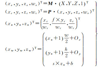 在式(2)中,M为将物方坐标(X, Y, Z, 1)T变换到视觉坐标(xe, ye, ze, we)T的矩阵;P为将视觉坐标变换为剪裁坐标(xc, yc, zc, wc)T的矩阵;(xn, yn, zn)T为归一化设备坐标(normalized device coordinate,NDC)。当成像视口的起点位于左下角时,f=1;当成像视口的起点位于左上角时,f=-1;(xw, yw, zw)T为投影后的窗口坐标,其中xw、yw代表像素在视口中的位置,zw代表像素深度;s和b为深度控制系数,在默认情况下s=b=0.5;(Ox, Oy)代表视口起点在设备上下文中的位置,默认情况下(Ox, Oy)位于原点0, 0处;(w, h)为视口大小。