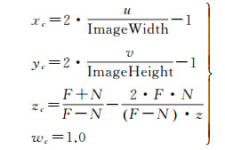 在式(3)中,wc被归一化为1.0,以提高后续透视变换的效率;视口大小(w, h)用影像大小代替;zc根据投影矩阵P中远近截面参数(F,N)形成的视椎体进行计算,详细原理参见文献[33]。