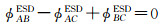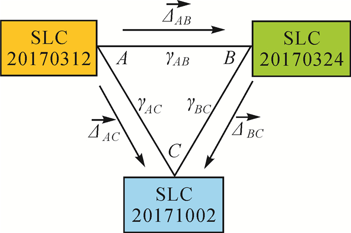本文拟引入DS-InSAR中的同质滤波技术和Phase-Linking技术进行增强谱分集处理,以提高增强谱分集干涉图质量,进而实现多基线条件下影像配准精度的提高。DS-InSAR技术主要通过分析时间维样本统计属性的相似程度,选取散射特性相同的像素进行同质滤波,并根据相位闭合原理(phase triangulation)对其缠绕相位进行phase-linking处理,以提高干涉图相位质量[40-43]。与常规的差分干涉图相同,增强谱分集干涉图也满足相位闭合原理[44]。假设Sentinel-1卫星A、B、C三景影像进行组合干涉,并进行增强谱分集处理,相应的增强谱分集相位由式(20)进行表示