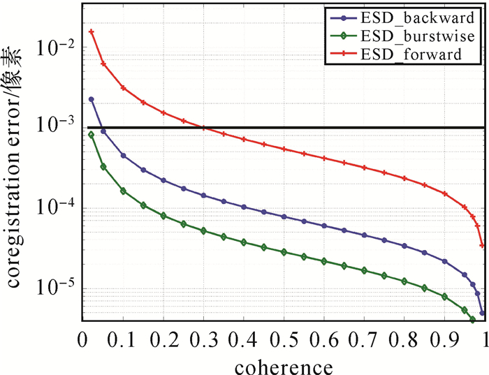 | 图 15 增强谱分集在前向、后向、方位向差异重叠区域精度差异 Fig. 15 Coregistration accuracy of the ESD for beamwise for-ward, backward, burstwise in overlapping areas |
