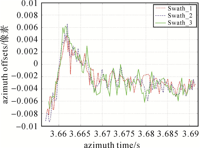| 图 16 增强谱分集估计的残余偏移量分布 Fig. 16 Azimuth shifts retrieved by ESD for three subswath |