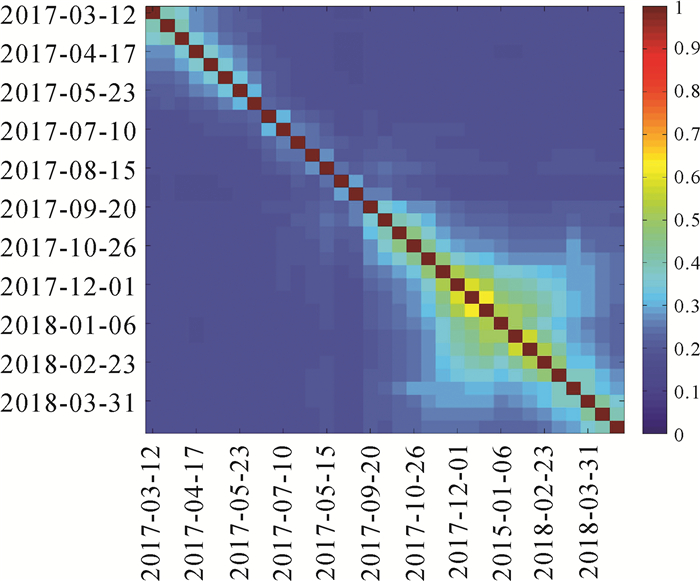 依据上述理论,本文选择覆盖图 6所示区域的33景Sentinel-1影像集进行干涉时序处理试验,其时空基线分布如图 17所示,参考主影像为2017-10-02。这些影像经过单基线配准处理后,再次进行多基线组合,共组成528个影像干涉对,对应的相干系数矩阵如图 18所示。本文处理数据时依据式(19)所示的加权方案解算式(16),得到每个辅影像相对于主影像的残余偏移量。试验结果发现多基线配准前后影像(2017-10-02)与影像(2017-04-17)之间的残余偏移量达到0.002像素,如图 19所示,多基线配准后增强谱分集相位直方图频率最大值对应相位更接近于零,表明多基线配准后残余偏移量更小,实施多基线配准可以优化单基线配准结果,进一步提高配准精度。InSAR时序处理通常面临新影像不断累积更新的问题,为了实现地表连续、动态形变监测,避免配准处理重复计算,本文建议采用序贯平差的方法解算多基线配准下的残余偏移量。