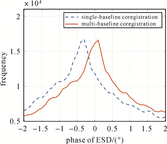 | 图 21 基于DS-InSAR技术处理后的增强谱分集相位直方图与原始增强谱分集对比 Fig. 21 Histograms of the measured residual ESD phases between original differential interferogram and estimated differential interferogram by DS-InSAR technique |