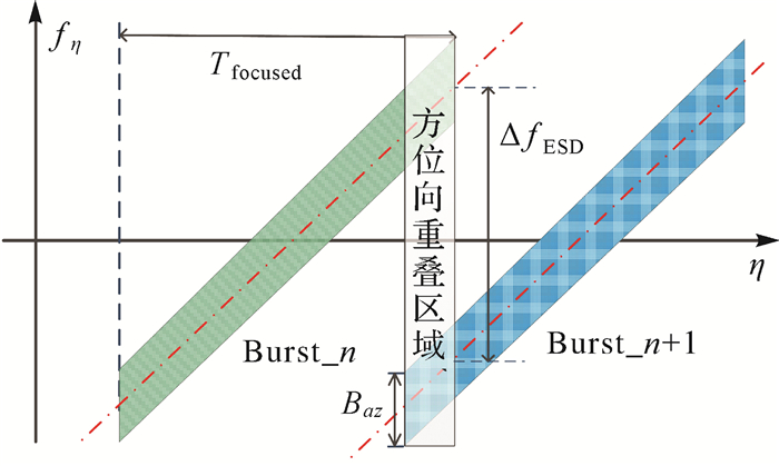 | 图 3 方位向增强谱分集中的Burst方位向频谱 Fig. 3 Time frequency diagram of two consecutive burst in azimuth sketching ESD |