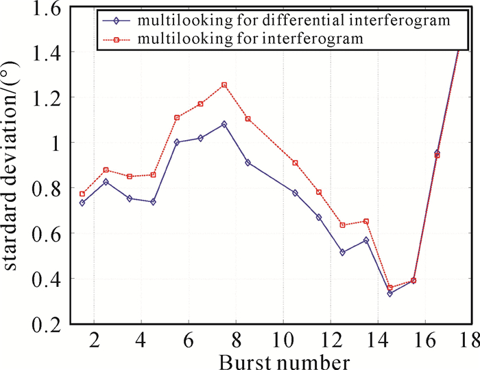 式中,ϕflat表示平地效应相位;ϕtopo表示地形效应相位。为了验证前置多视处理时去平地和地形效应处理对增强谱分集结果的影响,本文选取覆盖陕西省和内蒙古自治区113轨道的Sentinel-1A影像为试验数据,如图 6所示,影像覆盖区域属于风沙草滩地貌,人口密度较低,人工建筑较少,雷达影像后向散射特性以分布式目标(distributed scatterers, DS)为主,适合本文增强谱分集配准多视处理算法的验证。影像由两个Frame组成,本文则基于影像零多普勒时间对其进行方位向拼接,形成由54个Burst组成的长条带影像。以影像2017-10-02和影像2018-03-19组成的干涉对为例,分别对上下频带干涉图和上下频带差分干涉图进行多视处理,其增强谱分集结果如图 7和图 8所示。图 7为Burst影像增强谱分集相位直方图对比结果,图 7(a)为差分干涉图多视结果,相位分布较为集中,图 7(b)为干涉图直接多视后的结果,其相位分布较为分散。理论上增强谱分集相位分布应为干涉图相位分布的卷积,图 7(a)中相位分布直方图更加匀称,与理论相契合[25]。如果对比子测绘带中18个Burst的增强谱分集相位均方差(如图 8所示),可以发现上、下频带差分干涉图多视处理后增强谱分集相位标准差相对较小,而干涉图因多视信息丢失,导致增强谱分集干涉图相位噪声增大,增加了偏移量估计的不确定性。上述试验表明,增强谱分集前置多视需对上下频带干涉图进行去平地效应和去地形效应处理才能实现Sentinel-1卫星影像的高精度配准。但与后置多视相比,额外的去平地、去地形处理将导致前置多视计算效率偏低。因此高相干影像干涉对配准处理依然可以选择使用后置多视方案。