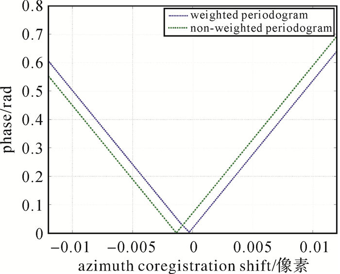 由于方位向重叠区域中增强谱分集多普勒中心基线基本一致,所以式(10)未考虑其对每个像素相位权重产生的影响。加权周期图估计方法理论上可以更准确地估计出影像配准的残余偏移量,假设多普勒中心基线为4000 Hz,方位向采样频率为486 Hz,残余偏移量为零,本文通过模拟均匀场景下的SAR影像增强谱分集相位对比分析等权和加权周期图估计方法精度的差异,并分别基于加权周期图和等权周期图进行偏移量估计,如图 9所示。其中横轴表示方位向偏移量,纵轴为周期图相位值,其相位最小值即对应偏移量估计结果。从图 9中可以看出,与等权周期图相比,加权周期图估计结果更接近于模拟的零残余偏移量,因此可认为加权周期图更能准确估计出偏移量。在实际应用中,当Burst重叠影像覆盖森林、水域等失相干区域时,其增强谱分集观测量不足,采用加权周期图参数方法可以确保影像偏移量估计的准确性。
