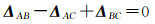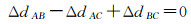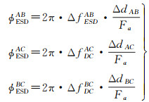 式中,多普勒中心基线为ΔfDCAB、ΔfDCAC、ΔfDCBC,理论上增强谱分集多普勒中心基线基本上一致,即ΔfDCAB≈ΔfDCAC≈ΔfDCBC,几何配准后的残余偏移量ΔdAB、ΔdAC、ΔdBC依然符合式(21)