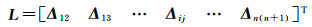 增强谱分集联合平差处理类似于秩亏水准自由网平差,其中矩阵A∈Rm×(n+1),矩阵中每一行对应一个影像干涉对,其中主影像对应矩阵元素+1,辅影像对应-1,如式(17)所示。假定i、j分别为影像编号,且1≤i, j≤n+1,ϕij表示影像序列中影像i与影像j的常规差分干涉相位,对应的增强谱分集估计的偏移量为Δij,L∈Rm×1为多基线配准时干涉对组合的残余偏移量Δij组成列向量,通常表示为