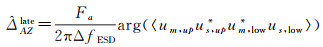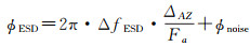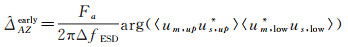 Sentinel-1卫星影像上、下频带成像间隔一般小于3 s,视角差异约为1.2°,根据图 2所示的增强谱分集几何模型可知,这一差异在对流层内引起的上、下频带视线最大距离约为250 m,此时大气效应处于强相关状态,对增强谱分集干涉图相位的影响可忽略不计,因此增强谱分集干涉图中理论上只存在失相干噪声ϕnoise[26-28]。Sentinel-1卫星轨道基线受到严格控制,Burst零多普勒影像方位向重叠区域持续时间大约0.3 s,通常认为几何配准处理后每个像素对应的残余偏移量是相同的。增强谱分集干涉图相位ϕESD与残余偏移量ΔAZ之间的关系如式(8)所示