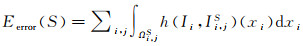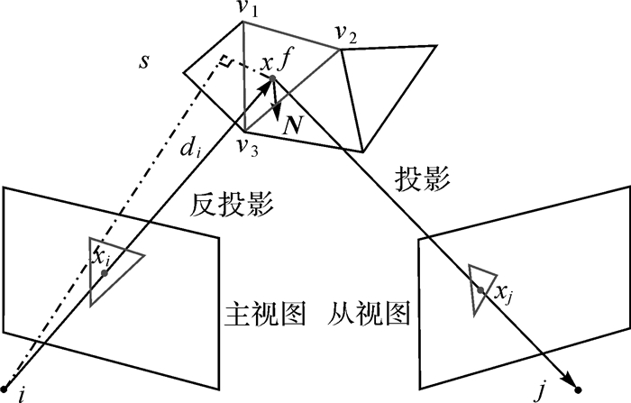 式(2)在三维空间上积分困难,为了更方便、有效地计算影像一致性,引入重投影误差,将积分空间转换到二维影像上[29]。如图 1所示,xi为视图i对应的影像上的一个像素点,反投影到表面S上得到点x,再由点x投影到视图j对应的影像上得到像素点xj,xj与xi的匹配程度即反映重投影误差。本文称i为主视图,j为主视图的从视图。由此,式(2)可改写为