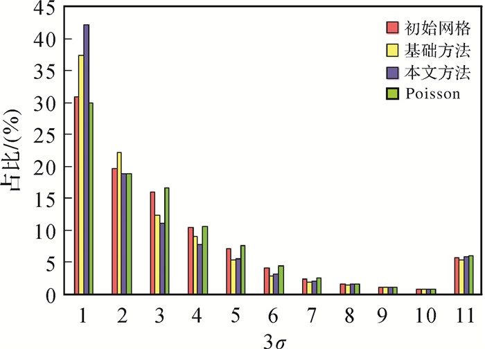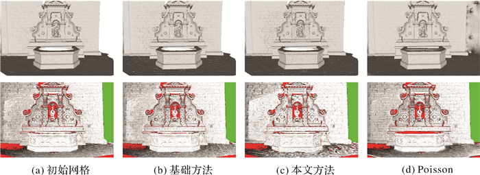 为评价优化精度,重点分析图 10中i=1时,即深度值差值在3σ内的像素占比:使用基础方法优化后的网格相比初始网格,比例提升了约6%;而本文方法在基础方法之上,比例再度提升了约5%,且本文方法相比Poisson(八叉树深度设为10,其他参数默认),比例提升了约12%。对应于图 11中(c)与(a)、(b)和(d)相比,在墙面、雕饰等处更接近白色。可见通过对主视图与从视图的选取,本文方法降低了质量较差的视图对的影像一致性对网格优化的干扰,故本文方法可提高优化精度。另外,图 10中i=11时,即深度值差值大于或等于30σ的像素占比可用于表示优化完整性,该比例越小,则优化完整性越好,可见本文方法的完整性略低于基础方法。结合图 11进行分析,在地面部分,(c)的红色区域略多于(b),因为本文方法在较大程度上依赖视图的质量,对于地面部分,观测角度倾向为斜视,缺少优质的下视视图对这些三角面进行影像一致性优化,故本文方法在优化完整性上还有待提高。