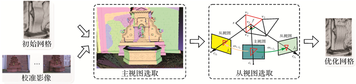如图 2所示,本文方法的主要输入为初始网格与带有相机标定参数的校准影像,首先在所有视图中为网格的每个三角面f选取最佳视图作为主视图i,即主视图选取(图中不同颜色代表选取的不同主视图);然后根据观测条件为主视图i的所有从视图j设置相应权重,以此排序进而选取从视图,同时为被选取的i与j构成的视图对(i, j)关于三角面f的3个顶点的影像一致性计算进行归一化加权,即从视图选取;最后,按照基础方法求取能量函数在网格顶点上的梯度,并利用梯度下降法进行迭代求解,由初始网格得到优化网格。
