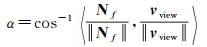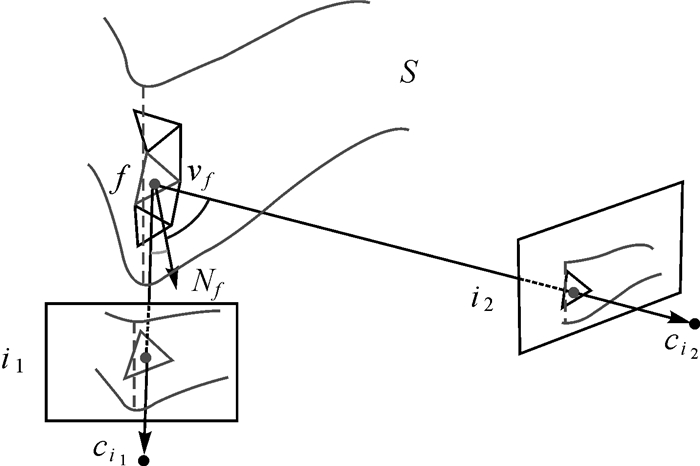 为进行轮廓检测,定义v1、v2和v3为S的3个顶点,vf=(v1+v2+v3)/3为f的中心,Nf为f朝外的法向量,Nv1、Nv2和Nv3分别为表面在v1、v2和v3处朝外的法向量,ci为视图i对应的相机中心,vview=vf-ci为由三角面的中心到相机中心的向量。则Nf与vview间的夹角α为