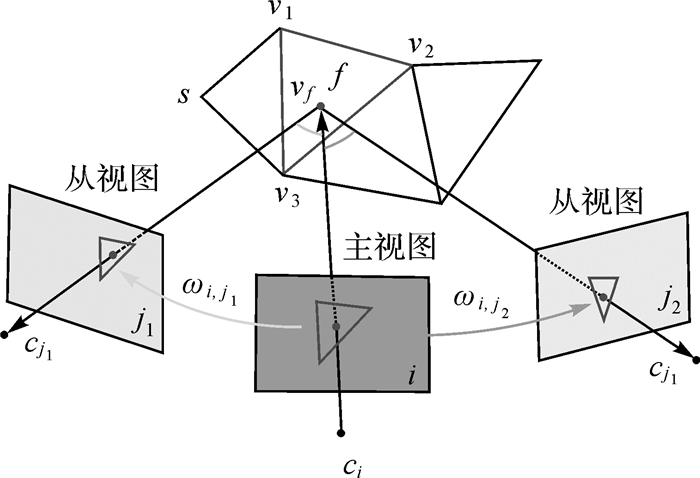 2 本文方法根据上述基础方法,在影像一致性的计算过程中,将需要经由网格进行重投影操作的视图定义为主视图,并将主视图重投影的对象视图定义为从视图,主视图与对应的从视图构成视图对。由式(4)可知,在基础方法的优化过程中,顶点的所有可视视图对均同等地参与其影像一致性的计算。考虑到视图的质量对影像一致性计算的影响,本文方法提出视图选取的策略,即从三角面的角度出发,新增主视图选取与从视图选取两个步骤。