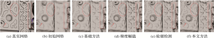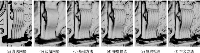为论证本文方法的各组成部分在提升网格优化质量方面的有效性,对fountain-P11的优化细节逐步进行对比分析:图 6和图 7(a)-(f)依次为fountain-P11的真实网格、初始网格、基础方法优化网格、只考虑影像梯度幅值选取主视图的优化网格、综合影像梯度幅值与轮廓检测选取主视图的优化网格、主视图选取加从视图选取的优化网格(即本文方法)。图 6和图 7(c)相比于图 7(b),利用影像一致性对初始网格进行优化,恢复了更多细节;(d)相比于(c),凹陷与凸出等纹理细节得到了增强;而(e)由于考虑了轮廓检测,更好地保持了边缘轮廓;(f)则通过对视图对的影像一致性计算进行归一化加权,进一步丰富了细节同时减少了噪声。值得注意的是图 6(d)由于仅考虑影像梯度幅值为部分三角面选取了不恰当的主视图,(e)则通过加入轮廓检测,有效地解决了该问题。