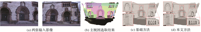 为进一步说明主视图选取在网格优化中所发挥的作用,选取Herz-Jesu-P25 3个不同部位的优化细节进行对比分析:图 8(a)为25张输入影像中的两张,(b)为主视图选取结果,(c)和(d)分别为基础方法与本文方法的优化网格。(b)中不同颜色代表为三角面选取的不同主视图,黑色代表对应的三角面无主视图,即位于地面等处的三角面在其所有可视视图上的质量均未达到最佳视图选取条件,从而忽略对这些三角面的影像一致性优化,在一定程度上实现了自适应分辨率优化,提高了优化效率。分析(c)和(d)中3个部位的优化细节图:位于模型正面及中部的三角面在多个视图上均呈现为较优观测,故基础方法与本文方法得到的优化结果在细节上的差异不是特别突出,如门廊上的人形雕塑;而靠近模型边界或位于模型侧面的三角面仅在少数几个甚至一个视图上呈现为较优观测,在其他可视视图上则质量较差,此时本文方法相比于基础方法在细节恢复上效果有显著提升,如门廊立柱及右上角的精细纹饰。说明通过综合影像梯度幅值与轮廓检测为每个三角面选取主视图,减少了冗余视图的影像一致性的计算,不仅提高了优化效率,还在一定程度上避免了质量较差的视图对优化造成干扰。