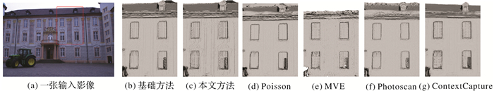 利用castle-P30将基础方法、本文方法与其他主流方法进行结果对比:表 1为不同方法得到的网格顶点数与三角面数;图 9(a)为30张输入影像中的一张,图 9(b)和(c)分别为基础方法与本文方法的优化网格,图 9(d)-(g)依次为Poisson、MVE、Photoscan和ContextCapture(原Smart3D)方法得到的结果(各参数均按超高精度进行设置)。对比图中的窗户及墙壁上的纹饰等处,本文方法相比于其他方法细节更清晰、丰富。可见本文方法能更有效地利用影像信息,恢复更多精细细节。