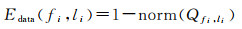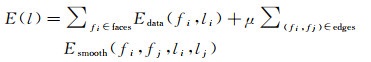 式中,l为所有面的最佳视图标签集;fi和fj为有公共三角边的邻接面;μ为比例参数,用于平衡数据项Edata与拓扑平滑约束项Esmooth。数据项用于度量利用影像一致性进行优化时,三角面在其可视视图上的质量;拓扑平滑约束项用于使邻接面的最佳视图标签尽可能保持一致。
