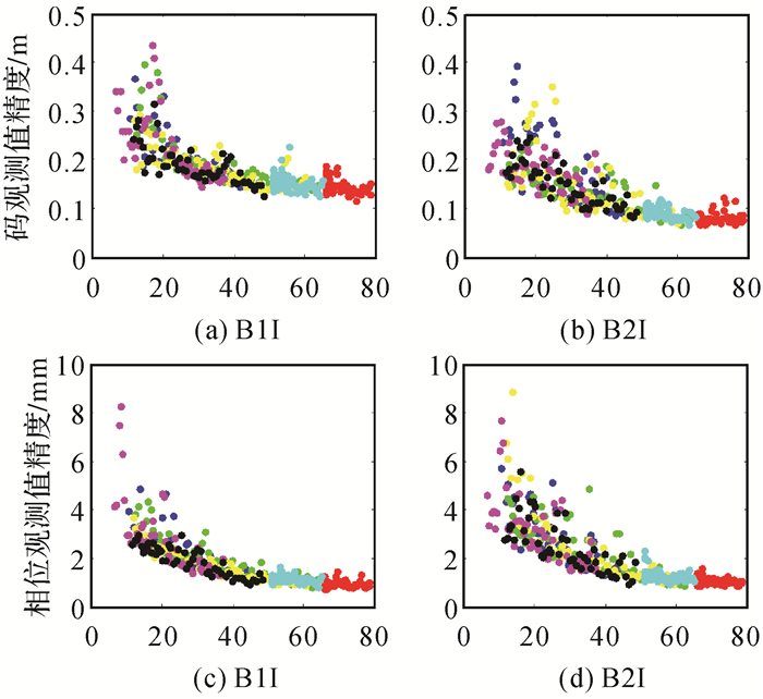 图 2至图 6分别给出了北斗二号GEO、IGSO和MEO 3类卫星和北斗三号IGSO和MEO卫星在各个频率上的伪距和相位观测值精度与高度角的关系。不同颜色表示不同卫星。GEO卫星相对于地球静止,所以高度角集中在几个高度角值附近,但也明显可以看出,高度角高时的精度优于低高度角的精度。北斗二号和北斗三号的IGSO卫星和MEO卫星的精度都与高度角明显相关,高度角越高,精度越好,但可以看出,不同观测值类型的相关程度并不相同。