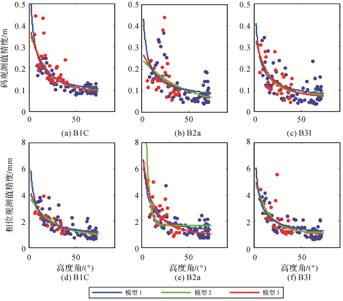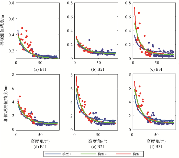 图 1给出了北斗二号B1和B2频率上伪距与相位观测值精度与高度角的关系,不同颜色表示不同卫星。所有类型观测值都与卫星高度角呈明显相关性,即高度角越高,观测精度越好,但不同类型的观测值,精度与高度角的关系不尽相同。表 3和表 4分别给出了北斗二号和北斗三号各个频率上的伪距与相位观测值的高度角加权模型拟合结果和拟合误差。模型2对各个频率上的伪距观测值的拟合误差最小;3种模型对相位观测值的拟合效果基本相当,拟合误差小于1mm。不同观测值的高度角相关程度和加权模型系数各不相同,所以,运用统一的随机模型定权的方法并不科学。