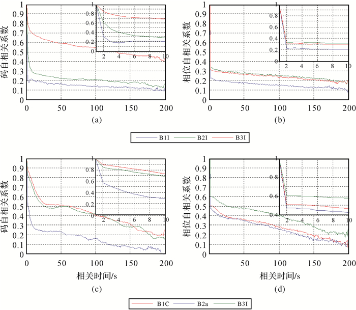 图 7给出了北斗各类观测值在前200s的时间相关性。每个子图右上方的小图代表各类观测值前10s的时间相关性。其中图 7(a)和图 7(b)分别表示北斗二号卫星码和相位观测值的时间相关性;图 7(c)和图 7(d)分别表示北斗三号卫星码和相位观测值的时间相关性。在图 7(a)和图 7(b)中,B1I、B2I频率上伪距和相位观测值的自相关系数从1开始迅速减小,最后稳定在0.1左右;B3I频率上伪距和相位观测值的自相关系数分别从1开始迅速减小至0.4和0.2左右趋于稳定。在图 7(c)和图 7(d)中,B1C、B2a和B3I频率上伪距和相位观测值的自相关性较北斗二号观测值几乎相当。B3I和B1C频率上伪距观测值的自相关系数则从1开始逐渐减小至0.2左右;B2a频率上伪距观测值的自相关系数则从1开始逐渐减小至零;B2a和B1C频率上相位观测值从1迅速下降至0.1左右;B3I频率上相位观测值从1迅速下降至0.2左右。由此可见,各类观测值的时间相关性确实存在,有些甚至不可忽略,不同类型观测值的时间相关性相差较大,在合理确定方差-协方差矩阵和实现高精度定位时应予以考虑。