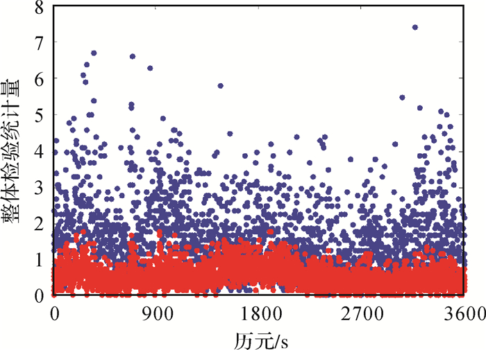 此部分分析随机模型对可靠性的影响,主要分析整体检验统计量。根据式(4),采用估计的随机模型和经验随机模型单历元解算模糊度固定解的整体检验统计量,如图 9所示。