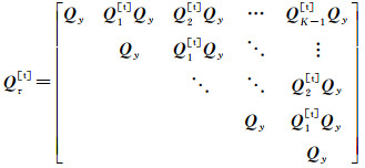 式中,y=[ϕT pT]T表示基线和双差整周模糊度改正后的单历元观测值;设计矩阵B=I6⊗es对应6个未知钟差参数b=[δtT, dtT]T;Qy为高斯白噪声εy的方差协方差(VC)矩阵,Qϕ和Qp分别表示单差相位和伪距观测值的VC矩阵。连续K个历元的单差观测方程为