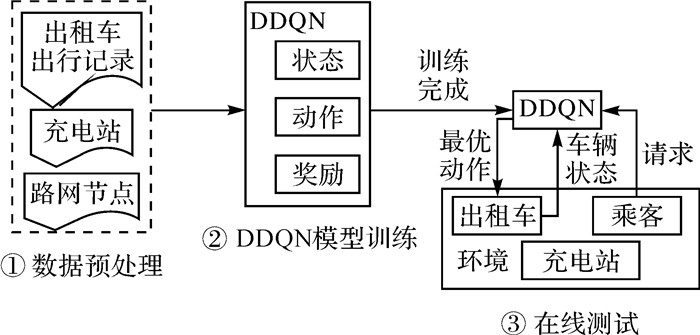 本文面向电动出租车复杂运营过程,构建适应电动出租车的复杂运营特性的MDP框架,提出优化电动出租车运营决策的双深度Q学习网络(double deep Q-learning network,DDQN),为电动出租车推荐长期价值最大化的策略,优化电动出租车运营。研究框架如图 1所示,包含数据预处理、DDQN模型训练和在线测试3个部分。本框架可用于传统、网约或自动驾驶电动出租车的运营决策优化,促进电动出租车的推广,实现更加高效、节能和环保的出行。