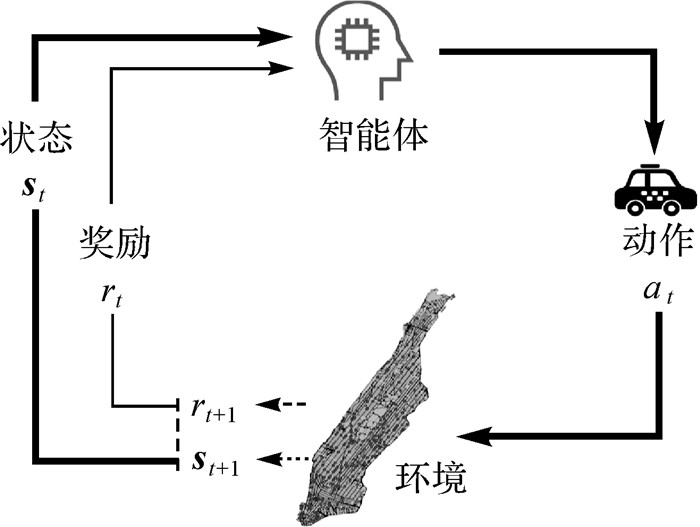 1.2 深度强化学习强化学习是机器学习的重要分支,其特点是无需提前给定解决问题的策略,根据环境采取行动,通过在线自学习获得策略的改进[24]。强化学习包括智能体、环境、动作、状态、奖励等要素,如图 3所示,智能体根据自身的状态st,选择执行相应的动作at,并改变自身状态。与此同时,智能体所处环境会对动作的优劣作出正面或负面的评价,即奖励rt。强化学习的核心是试错(trial-and-error),智能体在执行动作后环境所给予的正向或负向奖励的刺激下,逐步形成对奖励的预期,产生能获得最大收益的最优行为策略[17]。在图 3的循环过程中,智能体不断进行在线自学习,最终其选择的动作应当使得奖励值不断增长。