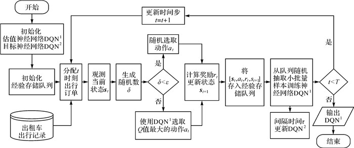 基于上述DDQN模型学习电动出租车运营的动作-价值网络,进行电动出租车运营决策。如图 4所示,初始化神经网络与经验存储队列后,通过不断递增时间步t, DDQN模型将不同涌现的出行需求分配至距离乘客最近的车辆。出租车利用训练后的动作-价值网络判断是否可以接受该次出行请求,或者随机性进行决策。如果10 min内未有车辆接单,则该次出行未被满足。