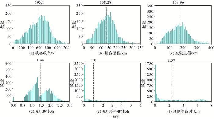 图 7进一步给出了基于DDQN推荐优化策略的电动出租车运营优化结果分布。在DDQN的优化下,95%的电动出租车日均收入高于200$,平均值595.10$,部分电动出租车日均收入超过1000$。载客里程和空驶里程也具有类似分布。绝大部分电动出租车平均每天需进行1—2次的充电。整体上看,充电时长有两个高峰,分别为1.3 h和1.9 h。DDQN模型能够很好地平衡载客、充电、等待和空驶过程。图 7(e)显示超过50%的出租车充电等待时长为0,使得平均充电等待时长大幅下降。DDQN模型还能减少无意义的空驶,在部分出行需求较少区域让电动出租车进行等待,部分车辆的日均等待时间超过2 h,如图 7(f)所示。