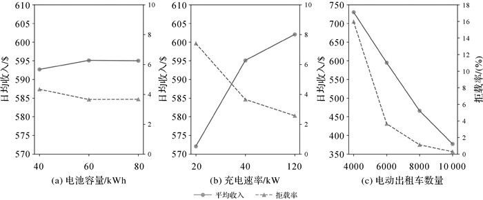 电动汽车的电池容量与其续驶里程线性正相关。随着电动容量增加,电动出租车可以满足更多的出行需求,日均收入小幅度增加。当电池容量从60 kWh进一步提升至80 kWh时,出租车运营收益并未得到明显增加。
