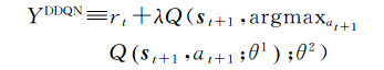 DDQN模型包含两个神经网络:估值神经网络DQN1和目标神经网络DQN2。估值神经网络DQN1用于选择下个时刻的最佳动作at+1=argmaxat+1Q(st+1, at+1θ1),使得st+1所对应的Q值最大,其参数θ1不断更新。目标神经网络DQN2用于评估所选取的下一时刻动作at+1的价值Q(st+1, at+1; θ2),得到时序差分目标Y=rt+λQ(st+1, at+1; θ2),其参数θ2在间隔时间τ后更新参数θ2=θ1,使得Y在时间τ内保持稳定。通过双深度Q网络,实现动作选择与动作价值评估的分离,保持一段时间内神经网络收敛目标Y的稳定,模型训练过程更加快速且易收敛。