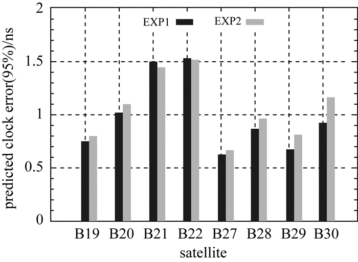 图 10对比了两组试验中各颗卫星的钟差预报误差(95%分位值)。可以看出,B21和B22的钟差预报误差要明显大于其他卫星,这可能说明这两颗卫星的时钟稳定性不如其他卫星。统计表明,试验1的平均钟差预报误差(95%)为0.992 ns;试验2为1.062 ns,相比试验1增加了7%。还可以看出,卫星B27-B30的预报误差普遍小于其他4颗卫星,这可能得益于这4颗卫星的星载氢钟[4]具有更好的性能。
